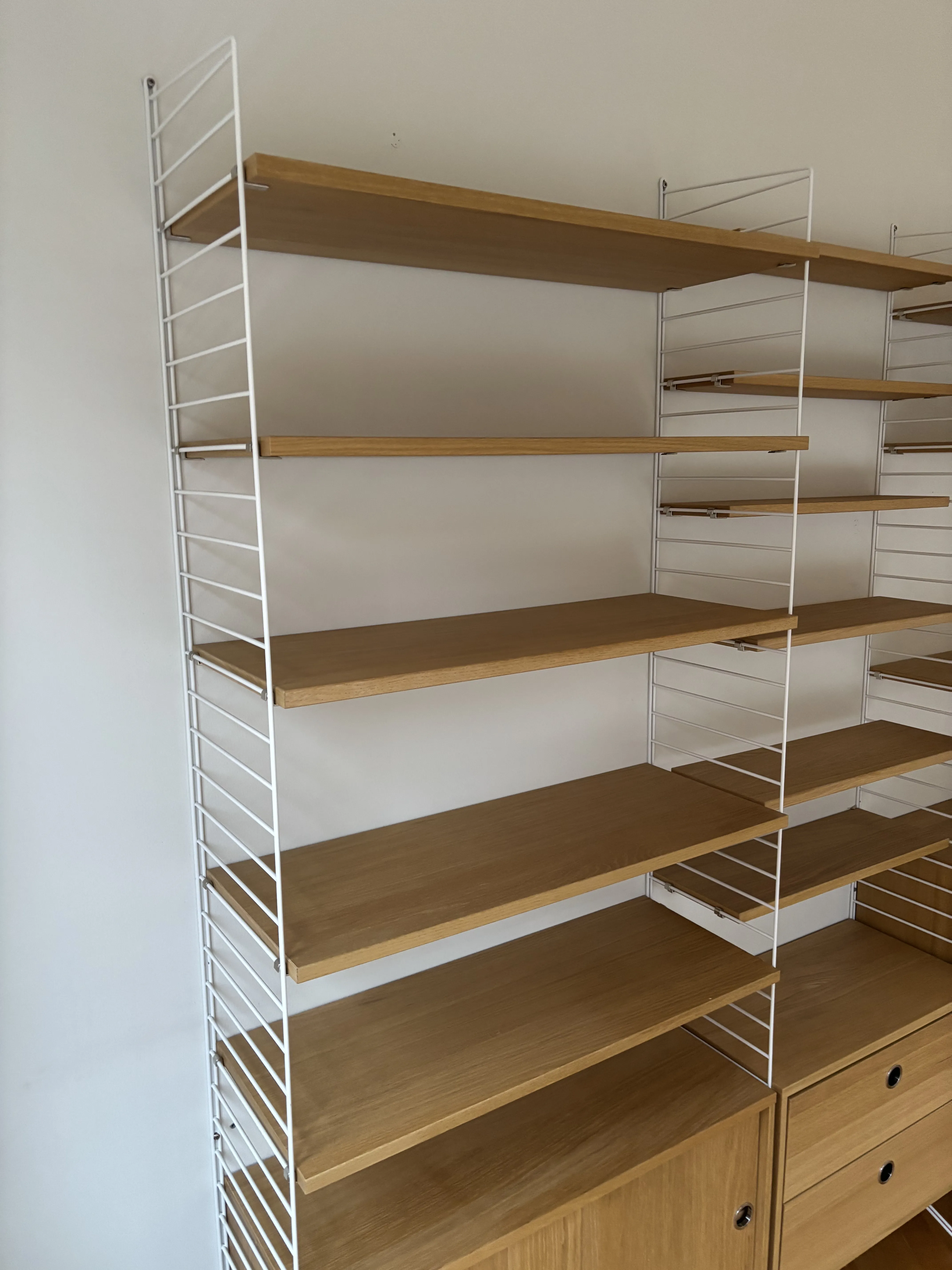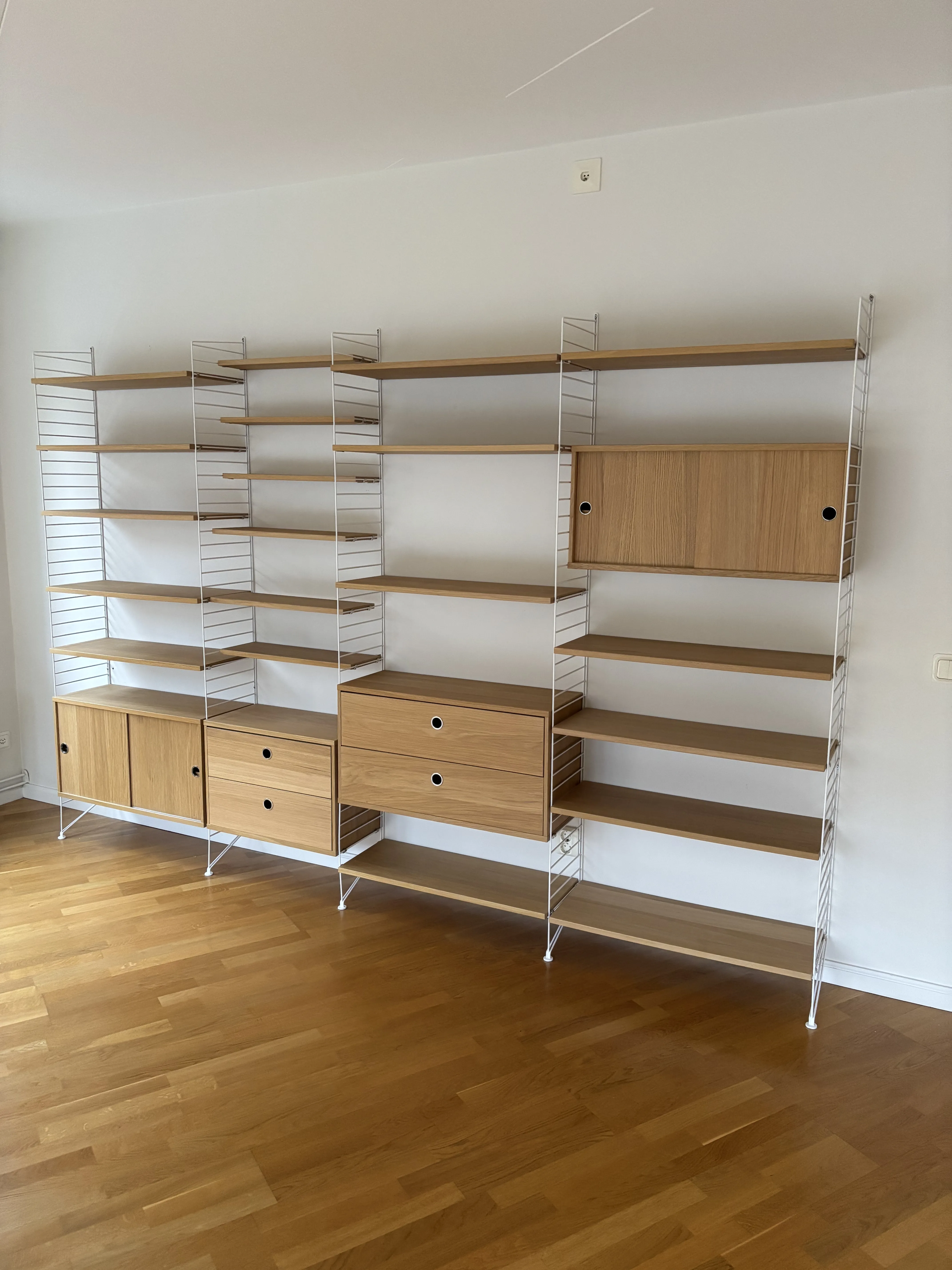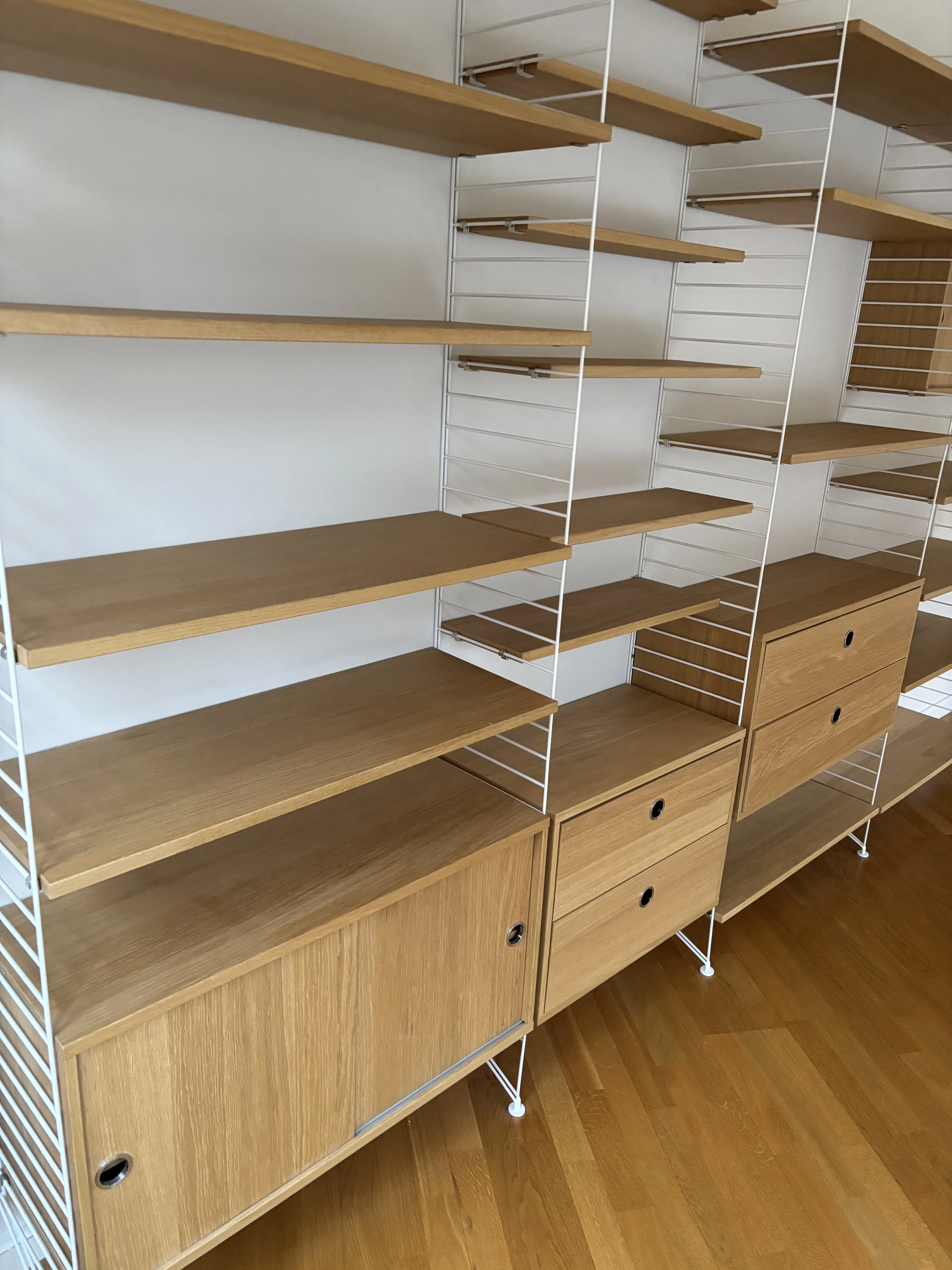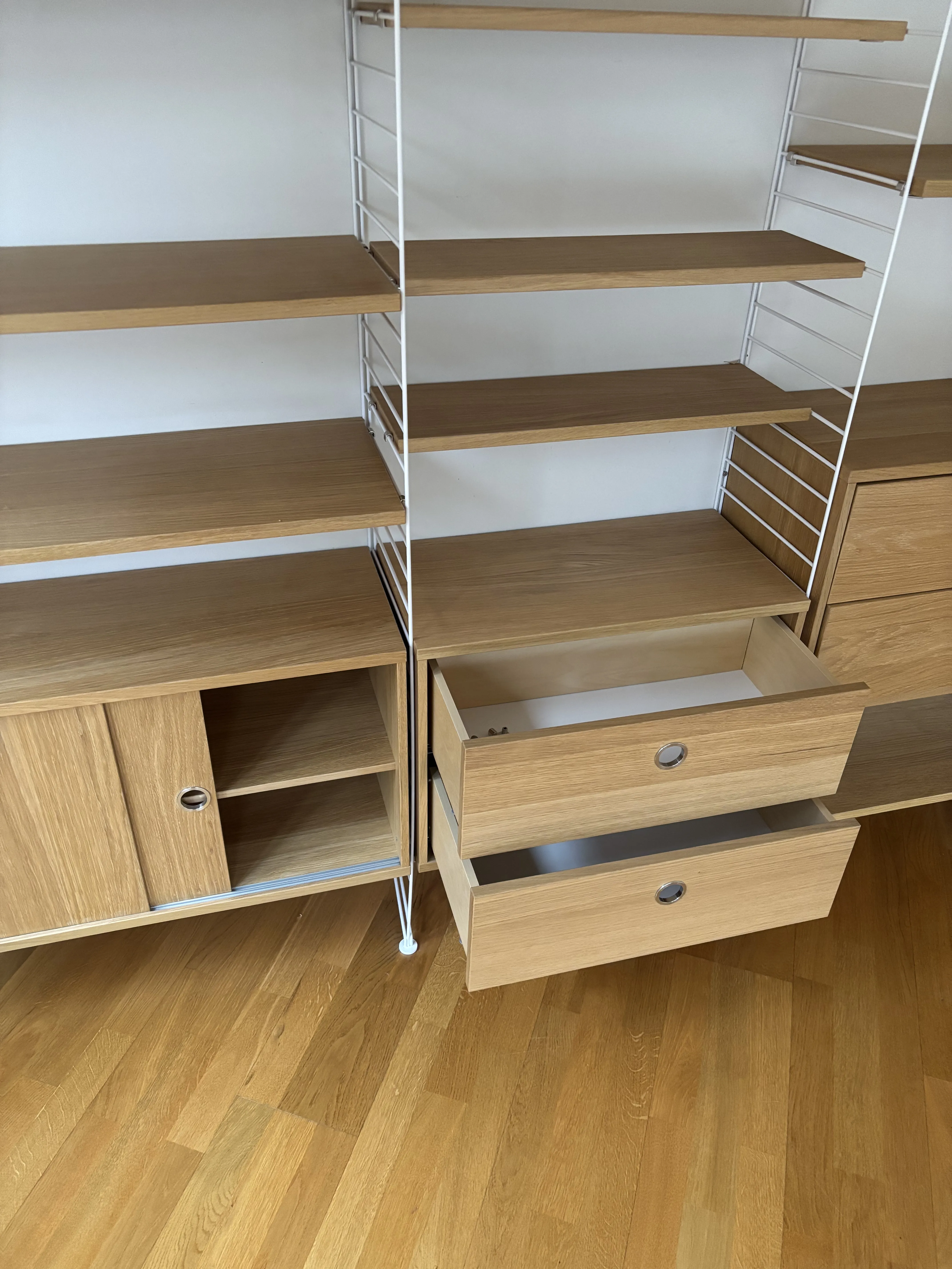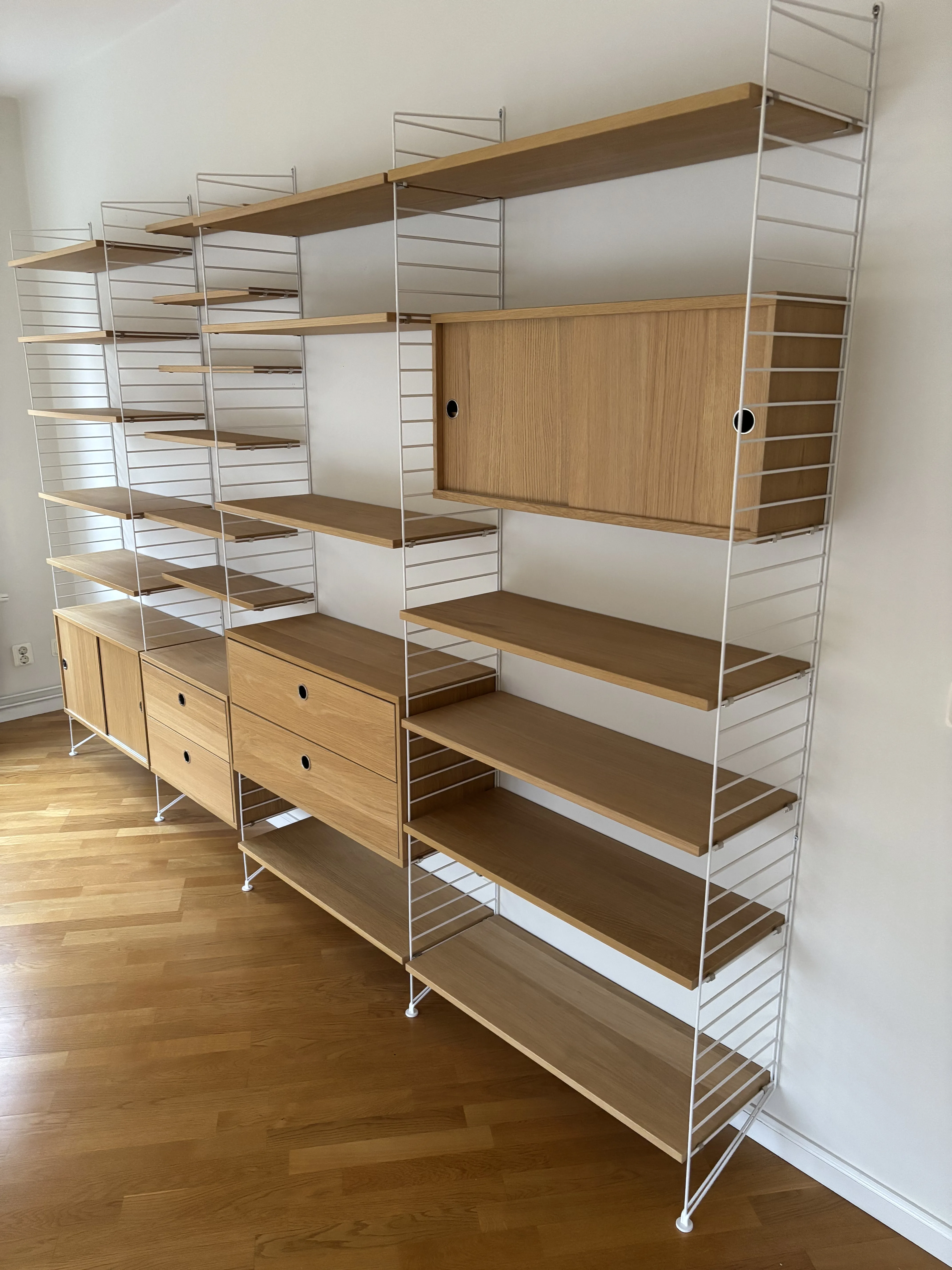 Nyare tillverkning, ek, med vitlackerade gavlar, 1 skåp med skjutdörrar, 78 x 42, djup 30, 1 skåp med skjutdörrar, 78 x 42, djup 20, en hurts med 2 utdragslådor, 78 x 42, djup 30, en hurts med 2 utdragslådor, 58 x 42, djup 30, 14 hyllplan 78 x 30 cm, 3 hyllplan 58 x 30 cm, 3 hyllplan 58 x 15 cm. Obetydligt slitage.