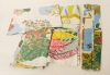 70 x 48 cm samt 79 x 117 cm Hawaii. 2 kuddfodral 60 x 39 cm, påbörjad sömnad, solblekt. 4 st gardinomtag.