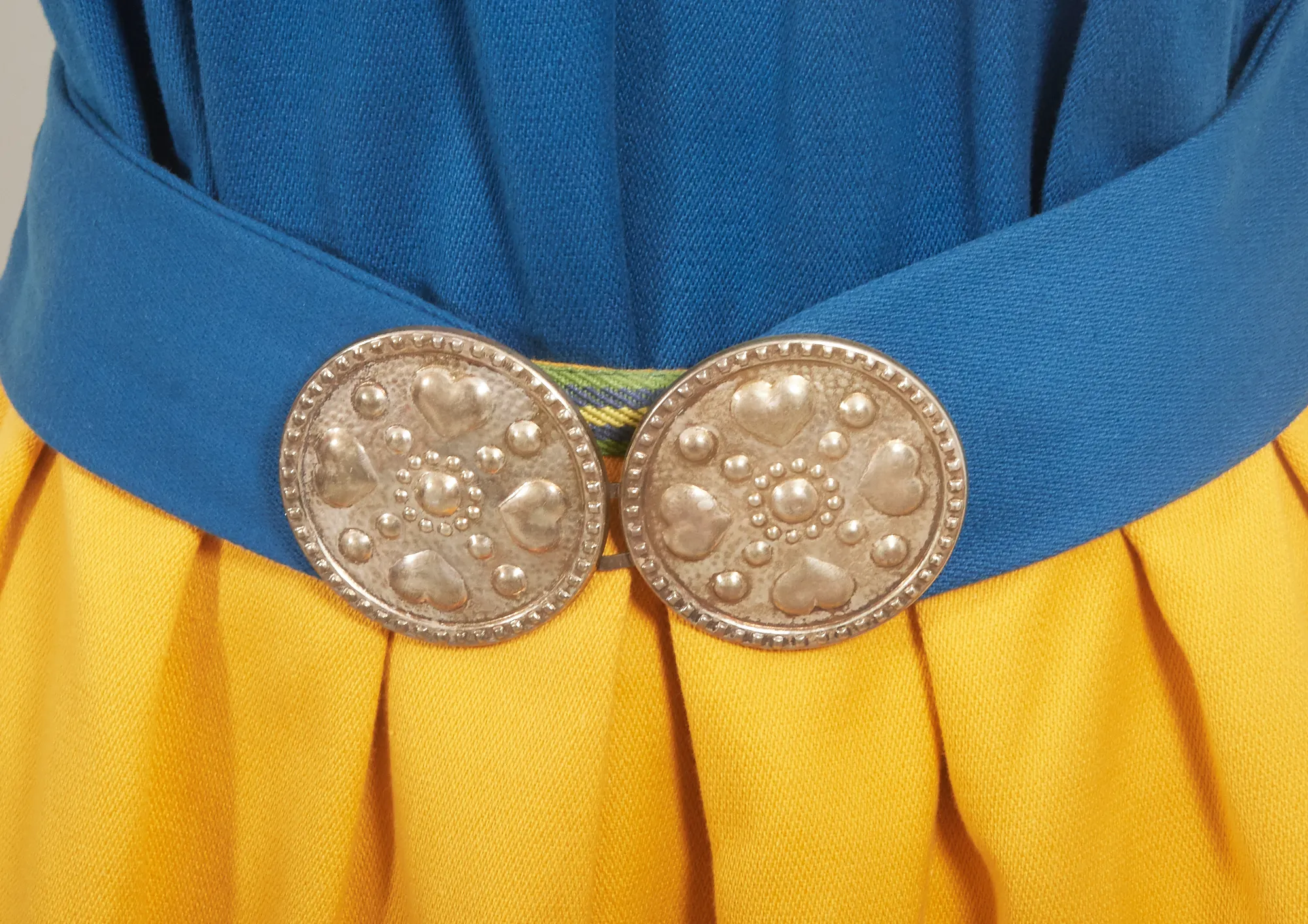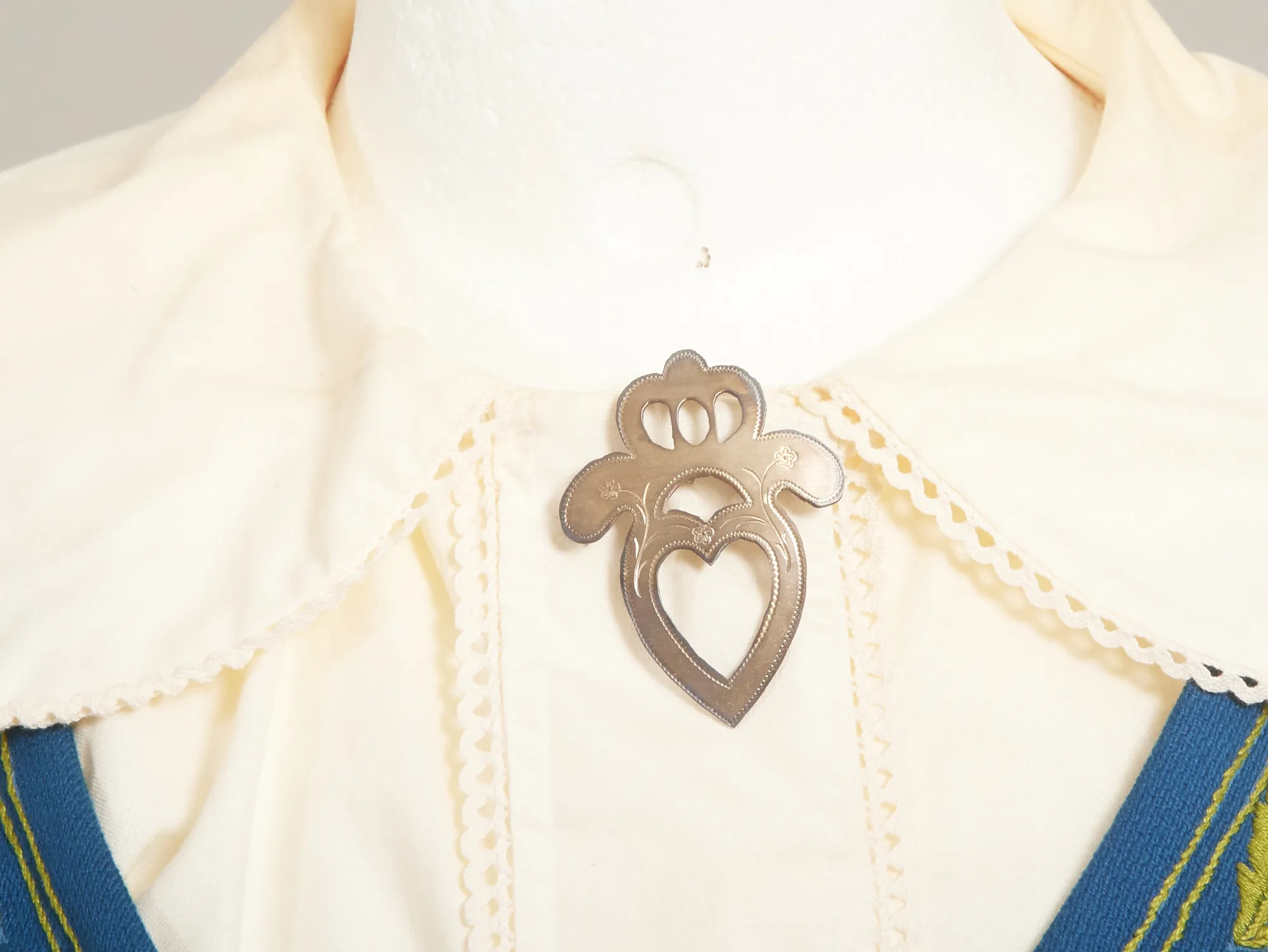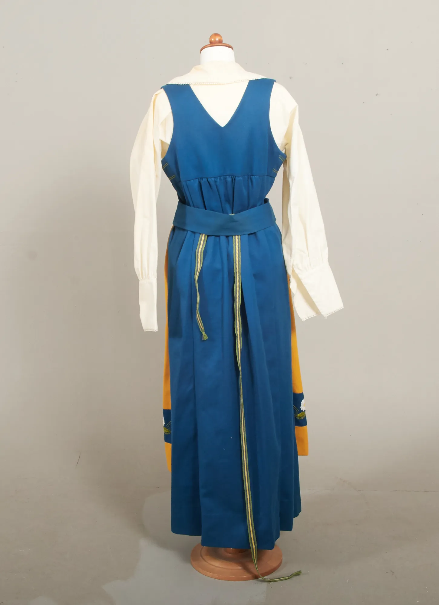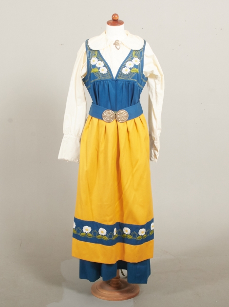 St 38-42, 6 delar. Klänning, underkjol (annan tillverkare) , blus, förkläde, skärp med silverspänne, samt brosch i silver. Blusen något gulnad i tyget.