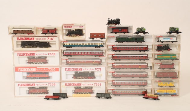 Fleischmann piccolo, 9 st lok, samt 26 vagnar. Bruksslitage.