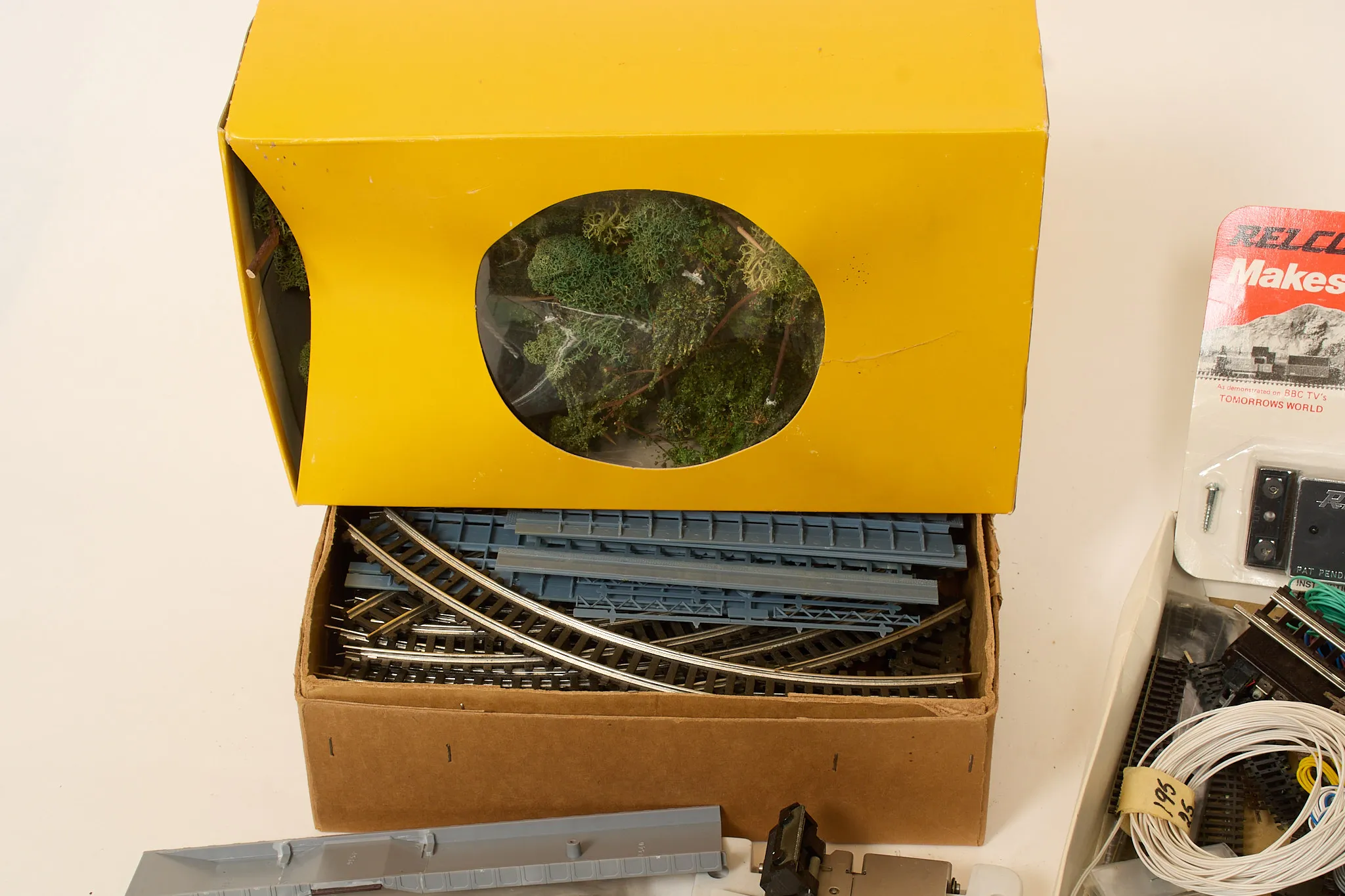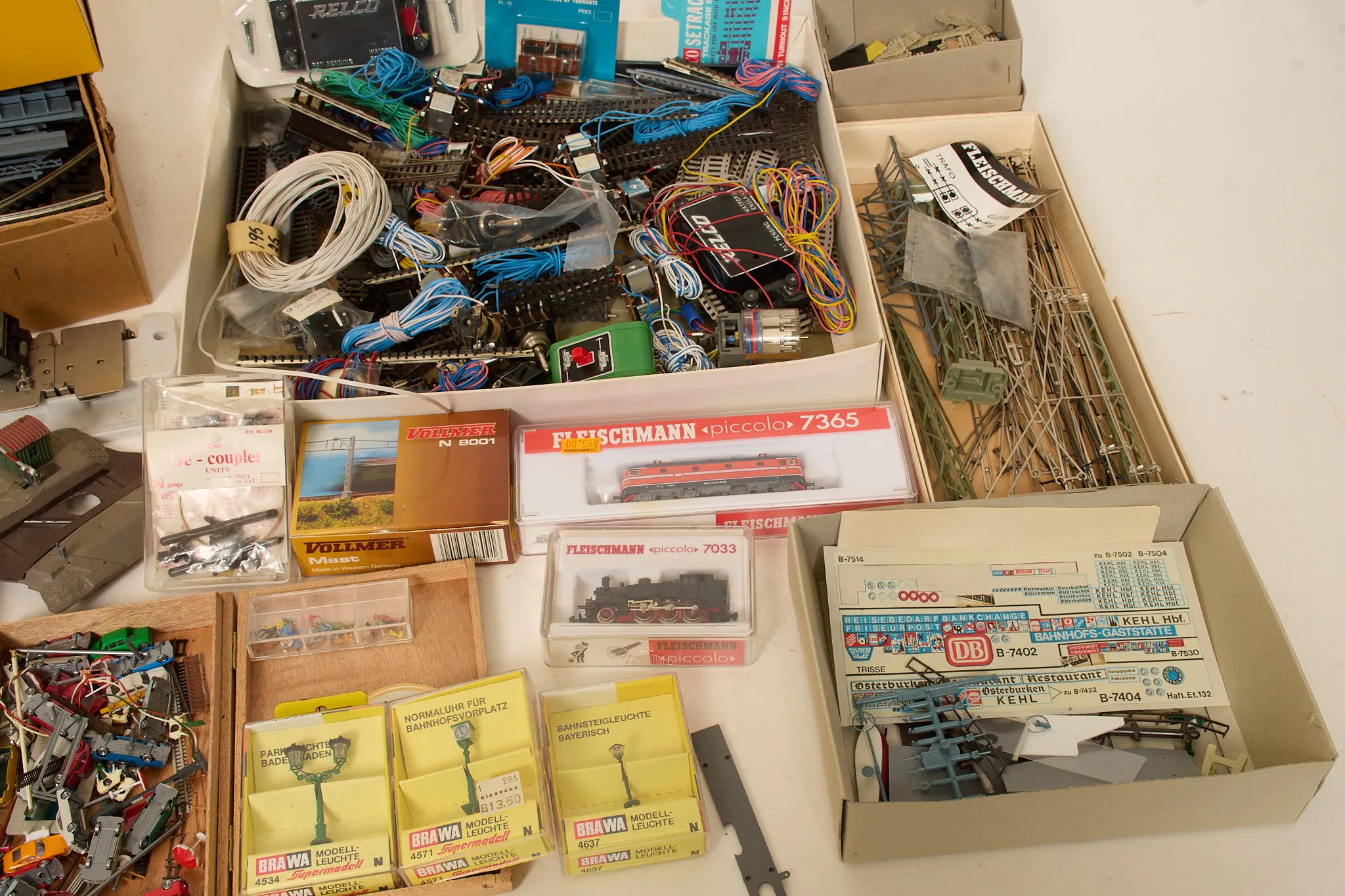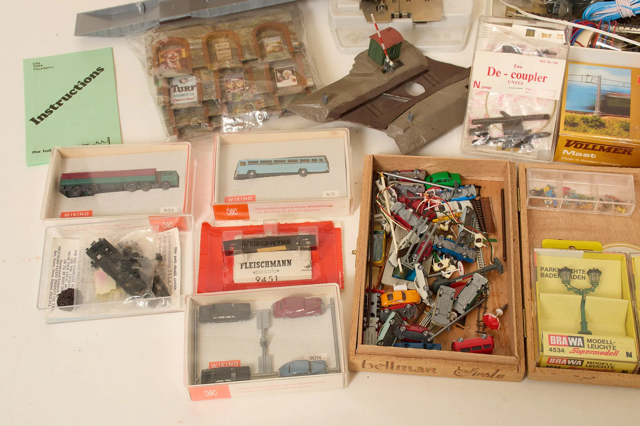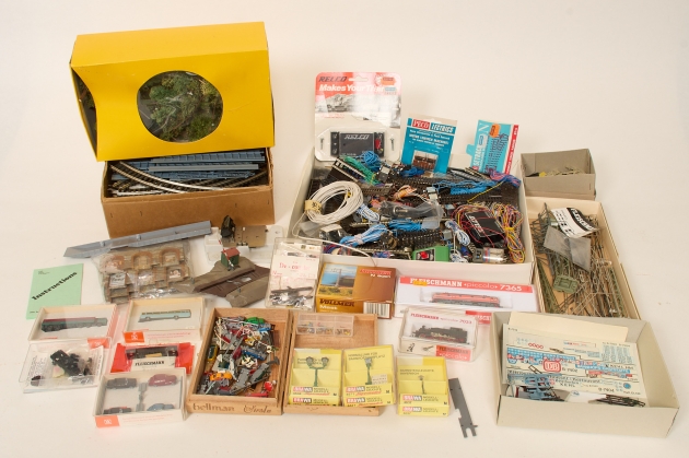 Skala N, 2 st lok Fleischman, stolpar, bilar, skenor, folk, träd, samt div delar.