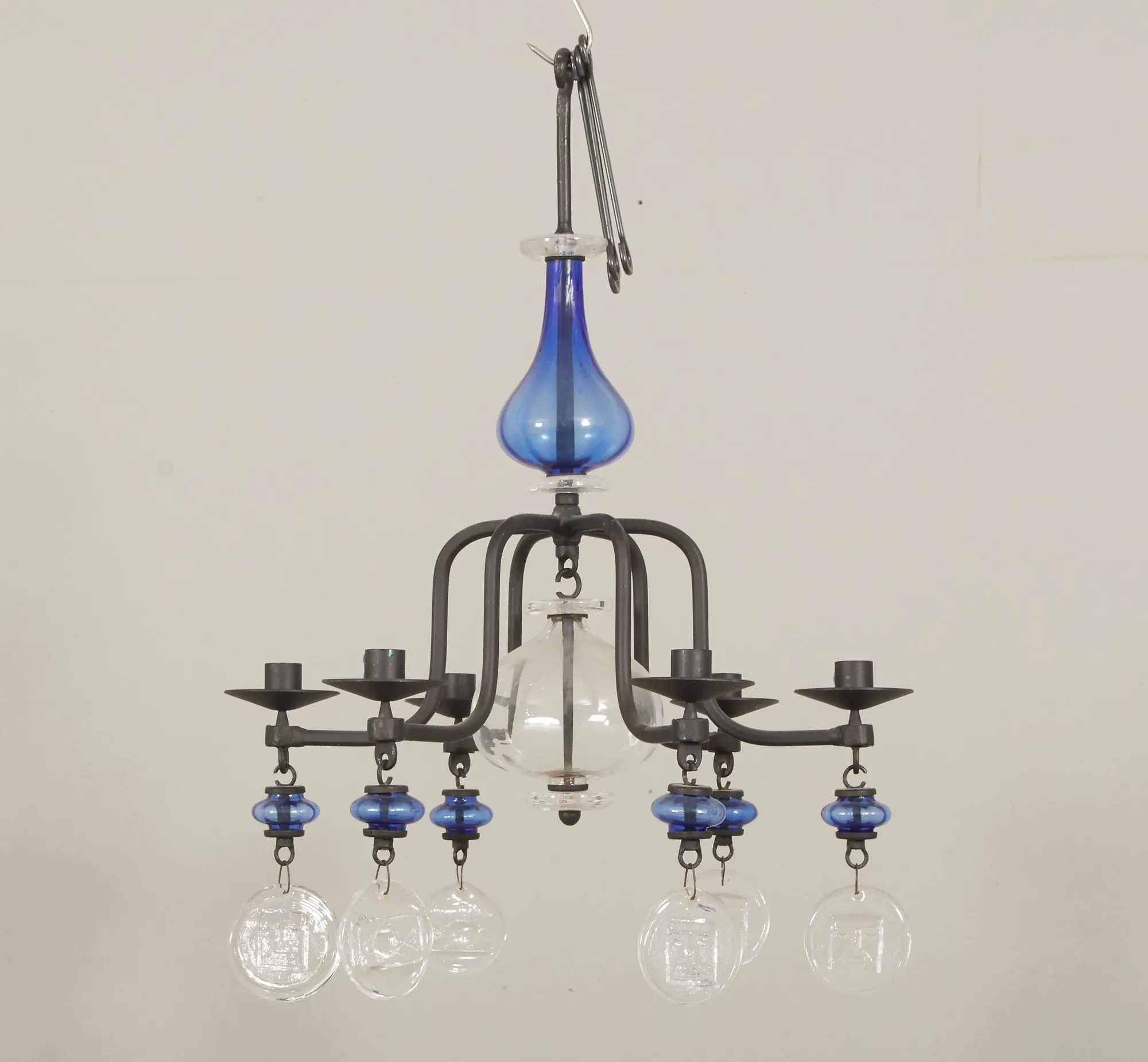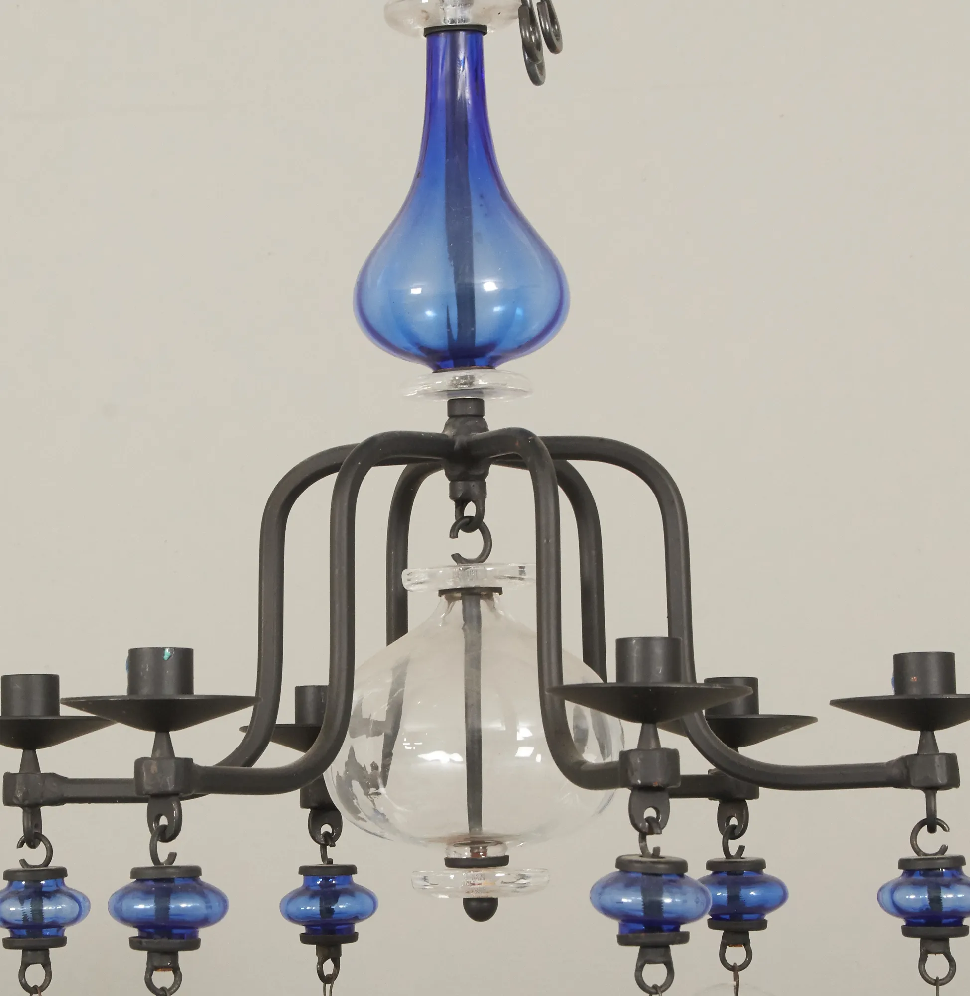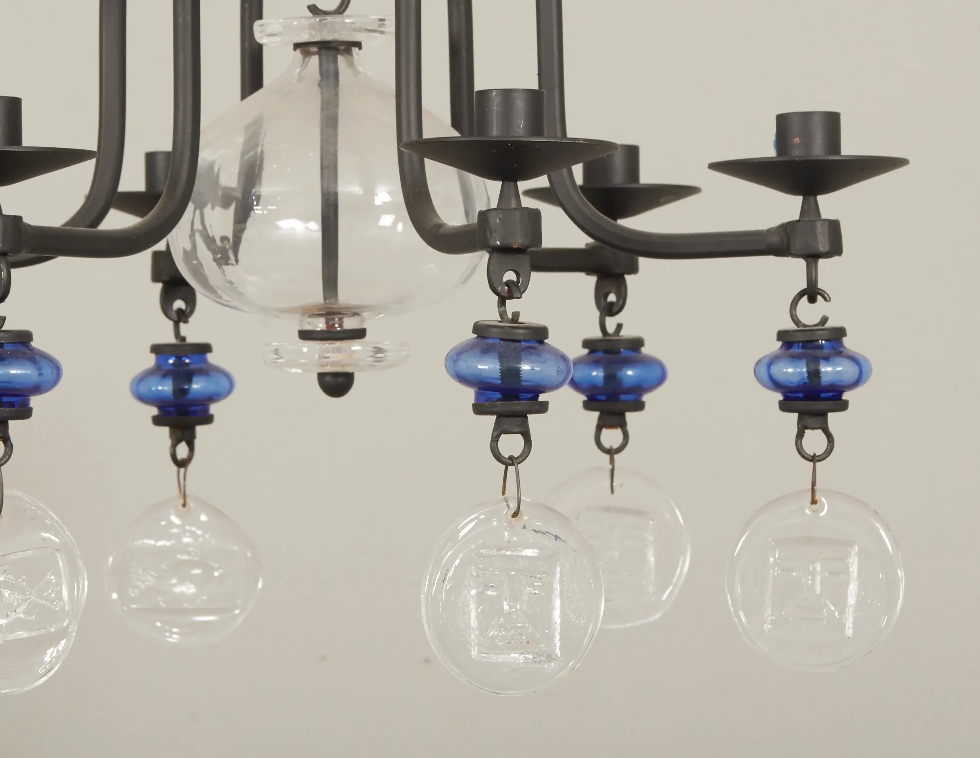 Smide, samt glas, hållare för 6 levande ljus, höjd 55 cm, 3 extra stag ´a 17 cm medföljer), smärre bruksslitage.