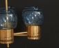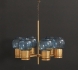 Mässing, med 6 elektriska ljuspunkter, kupor i blåtonat glas, diam ca 30 cm, höjd exkl upphängning ca 27 cm, smärre bruksslitage.