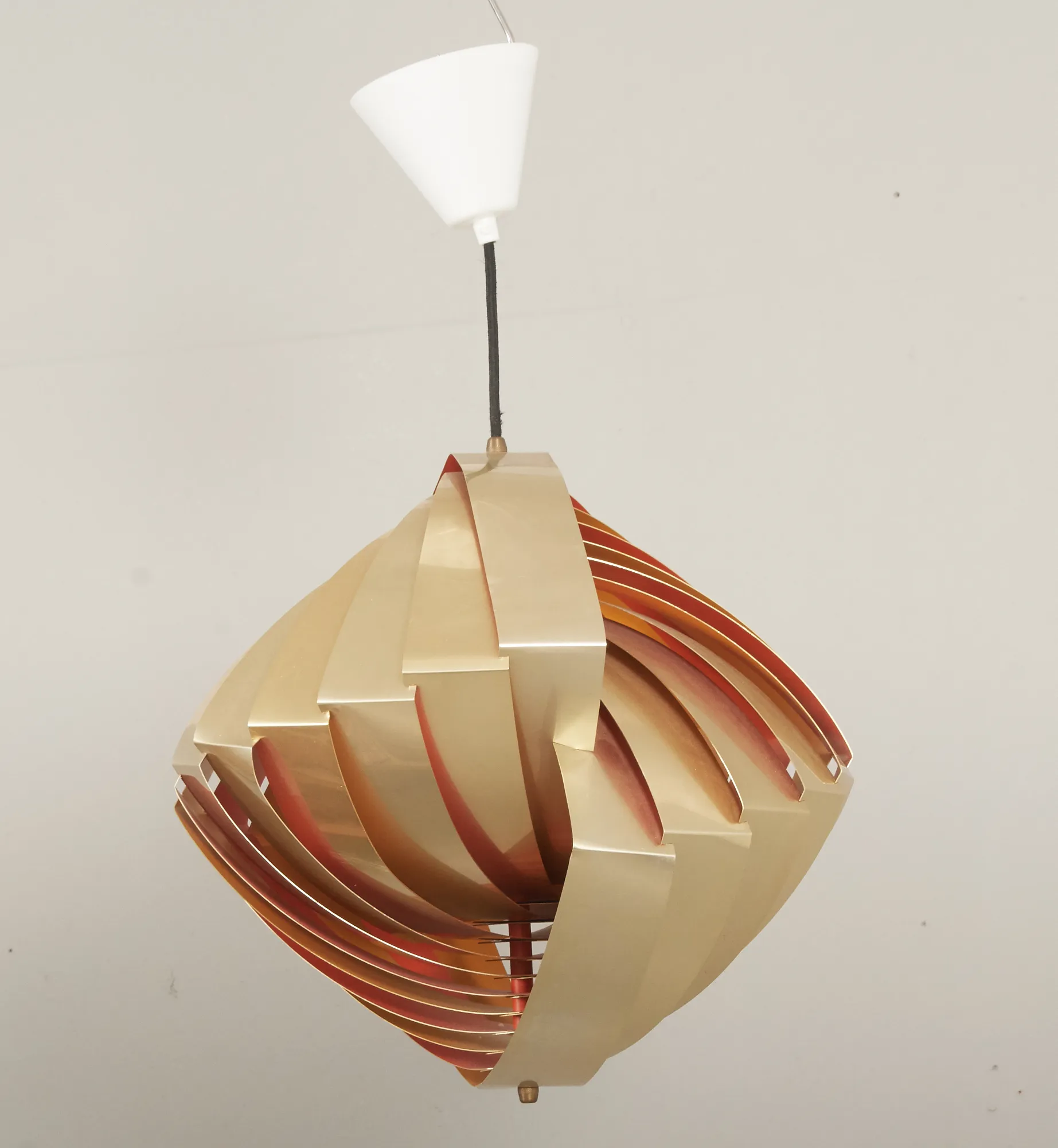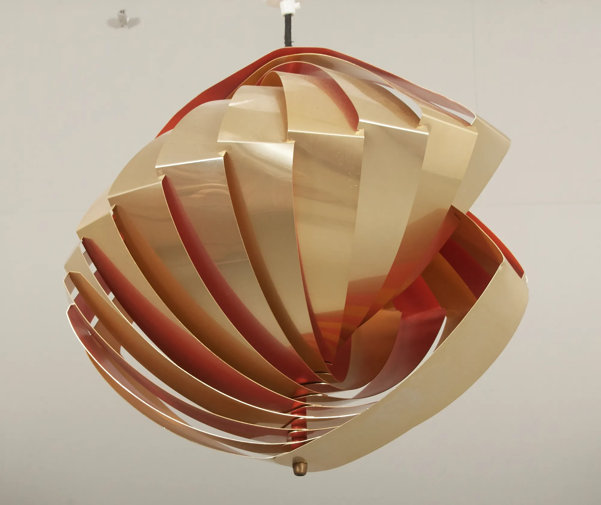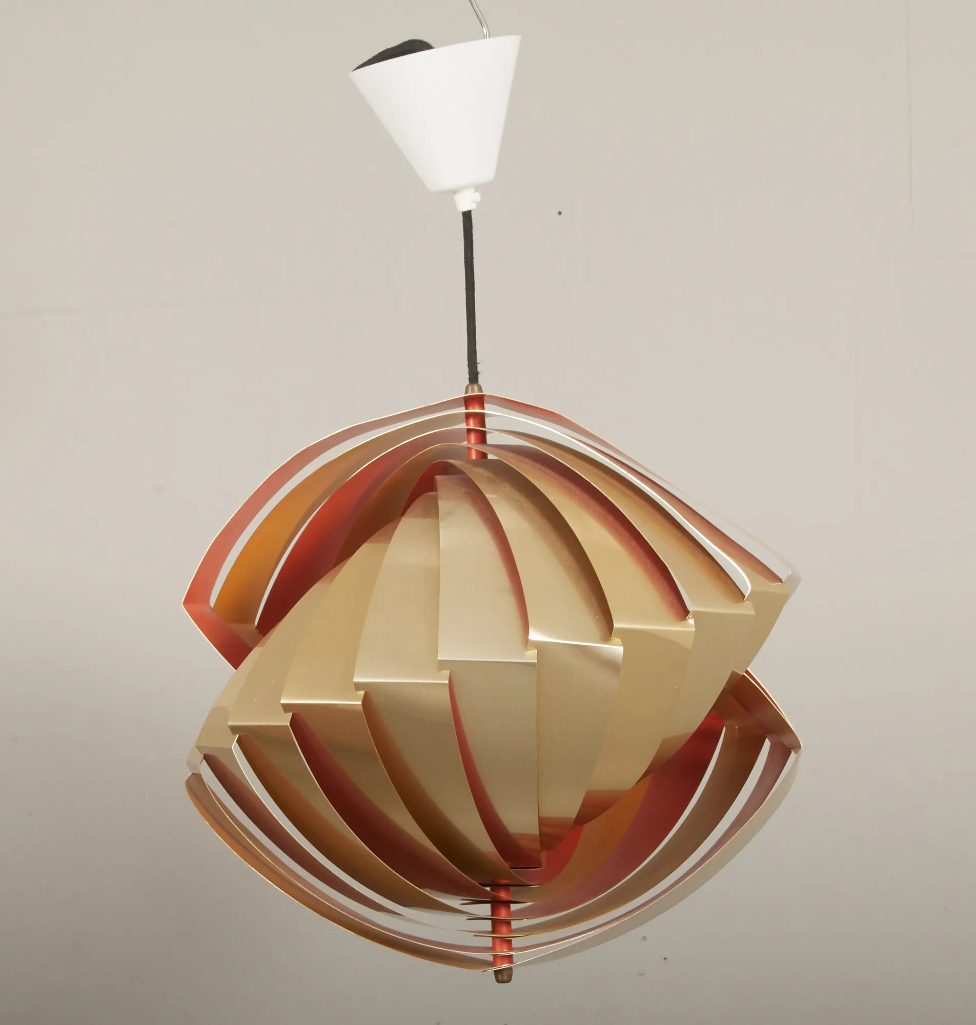 Danmark, formgiven 1968. Tolv mässingslameller, böjda samt sammanflätade. Diameter 40 cm, höjd ca 40 cm. Ej funktionstestad. Några lameller skeva.