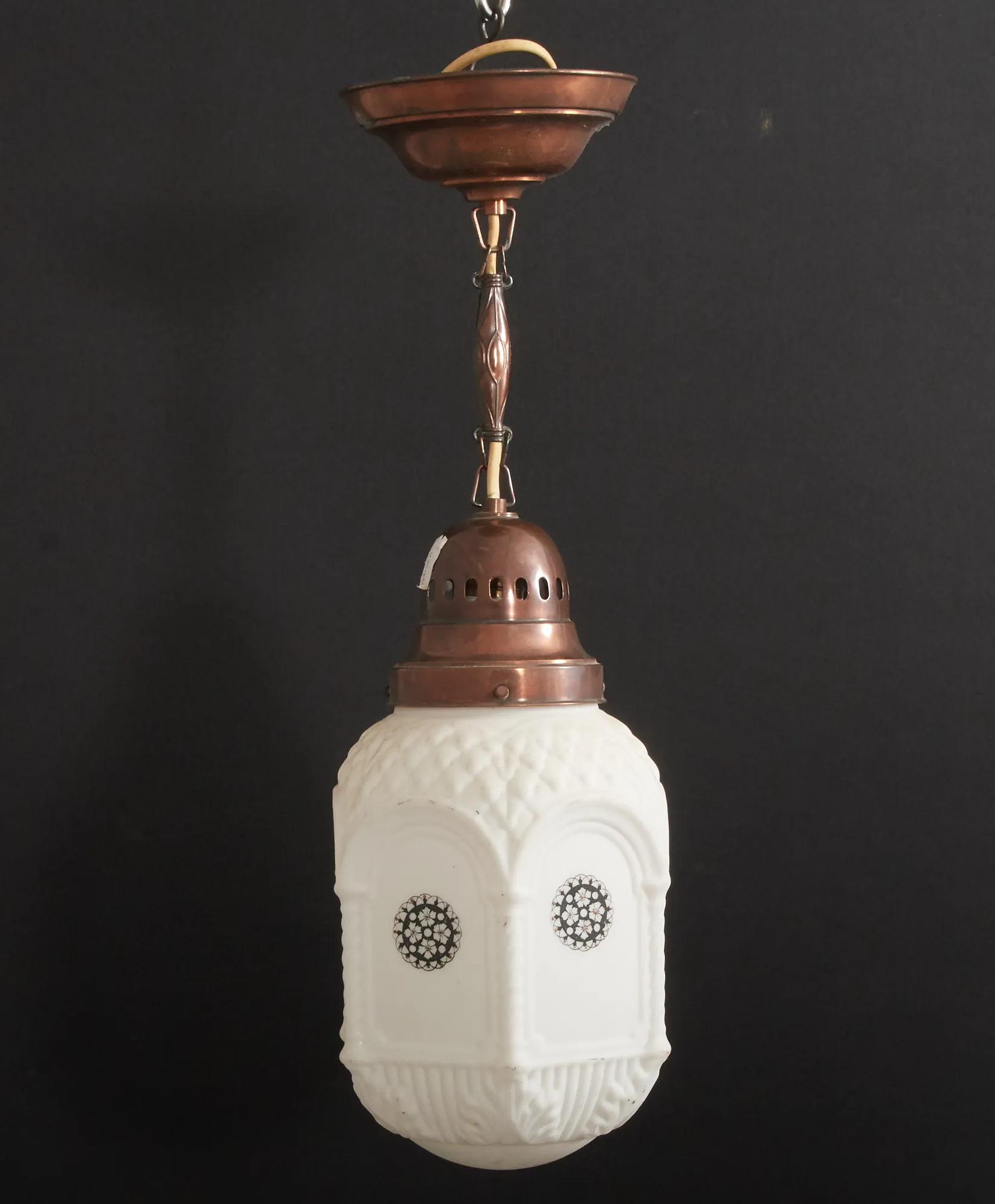 Koppar, samt opakt glas, höjd inkl upphängning 58 cm, bruksslitage.
