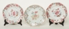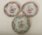 Ett par, dekor i Famille Rose, diam ca 22 cm, samt en diam 22,5 cm. en tallrik med mindre nagg, 2 med hårsprickor.