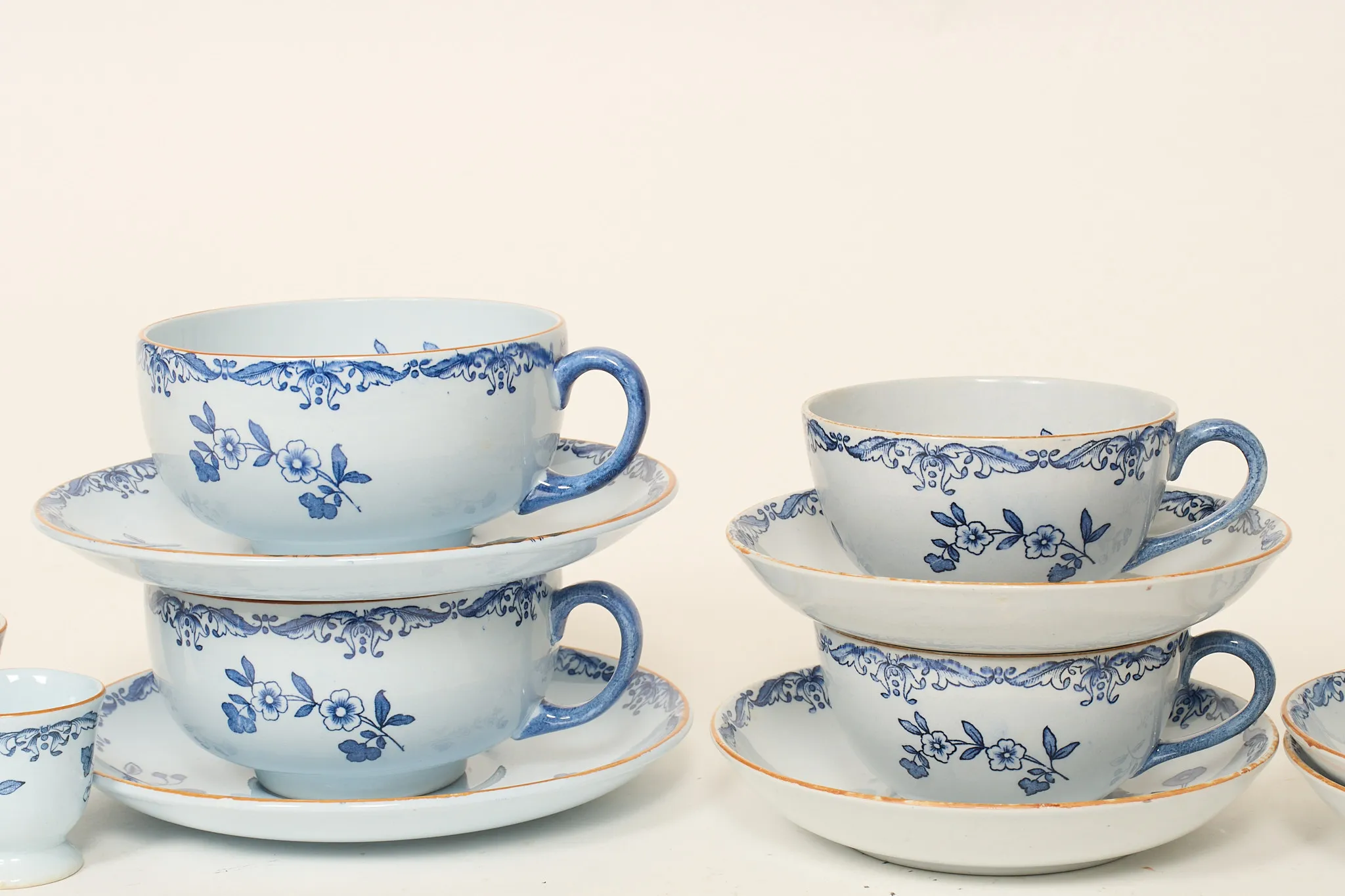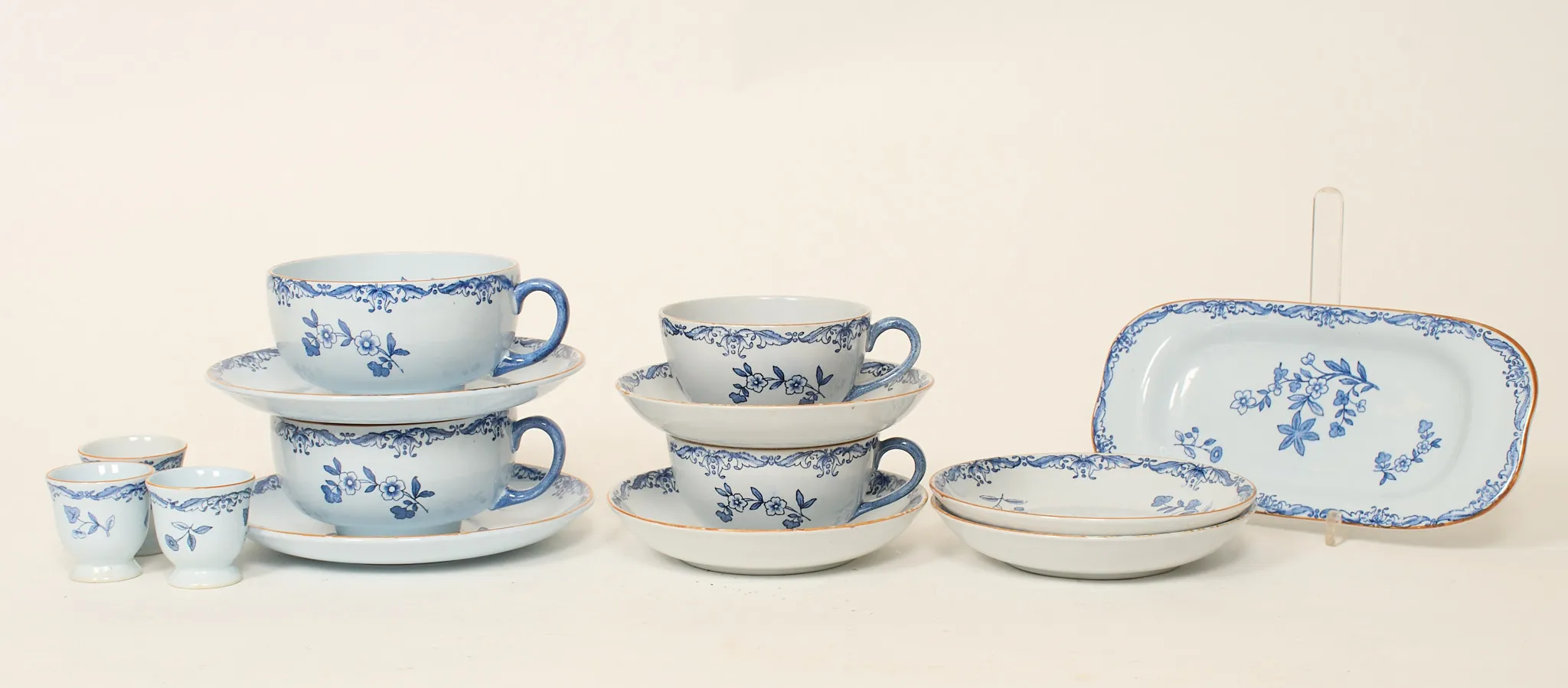 2 tekoppar med fat, 2 chokladkoppar med fat, 2 assietter, 3 äggkoppar, samt ett litet uppläggningsfat. Bruksslitage, en äggkopp med spricka.