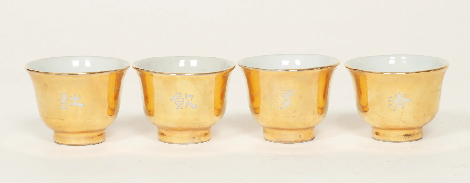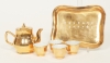 Kanna, bricka, samt 4 st koppar, förgylld dekor, samt kalligrafi, höjd kopp 4, kanna 9 cm, smärre ytslitage