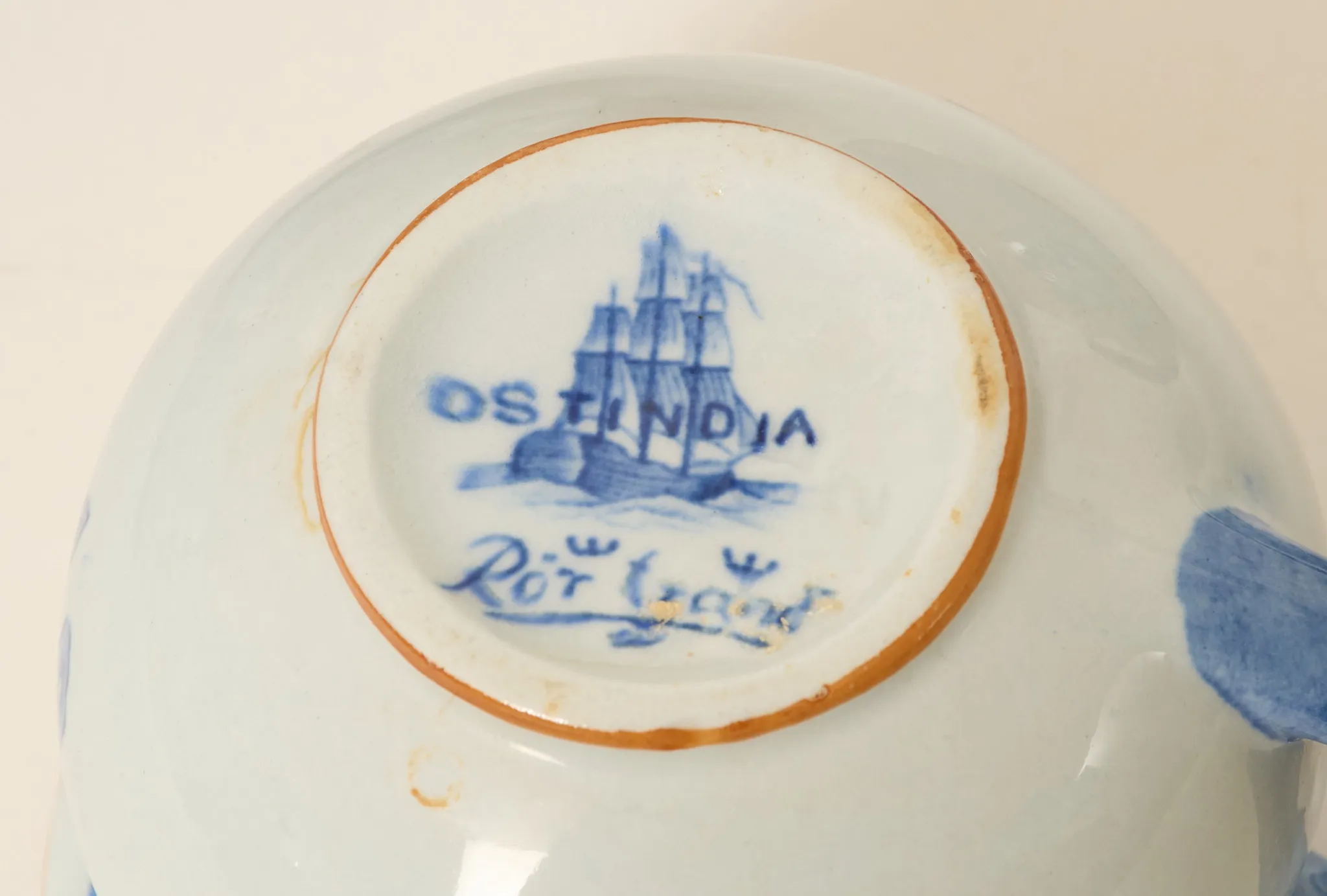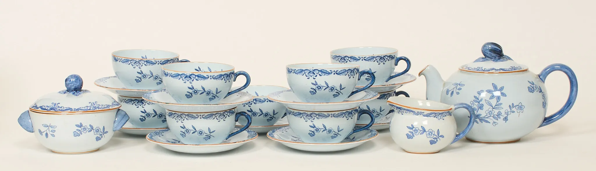 Äldre, samt nyare porslin, 9 koppar med fat, tekanna, mjölkkanna, samt sockerskål (med avvikande lock). Bruksslitage, glasyrkrackeleringar, enstaka delar med missfärgningar.