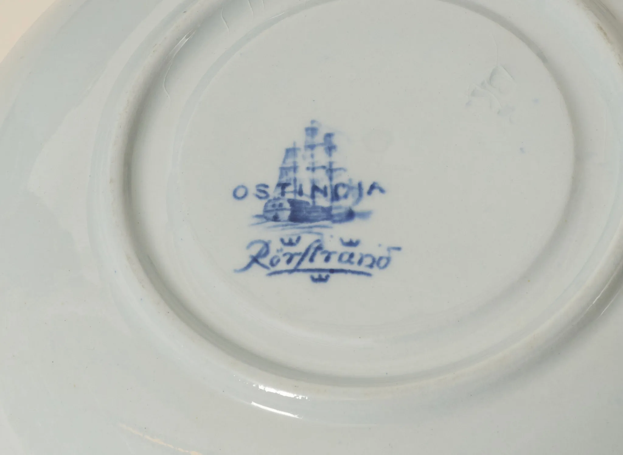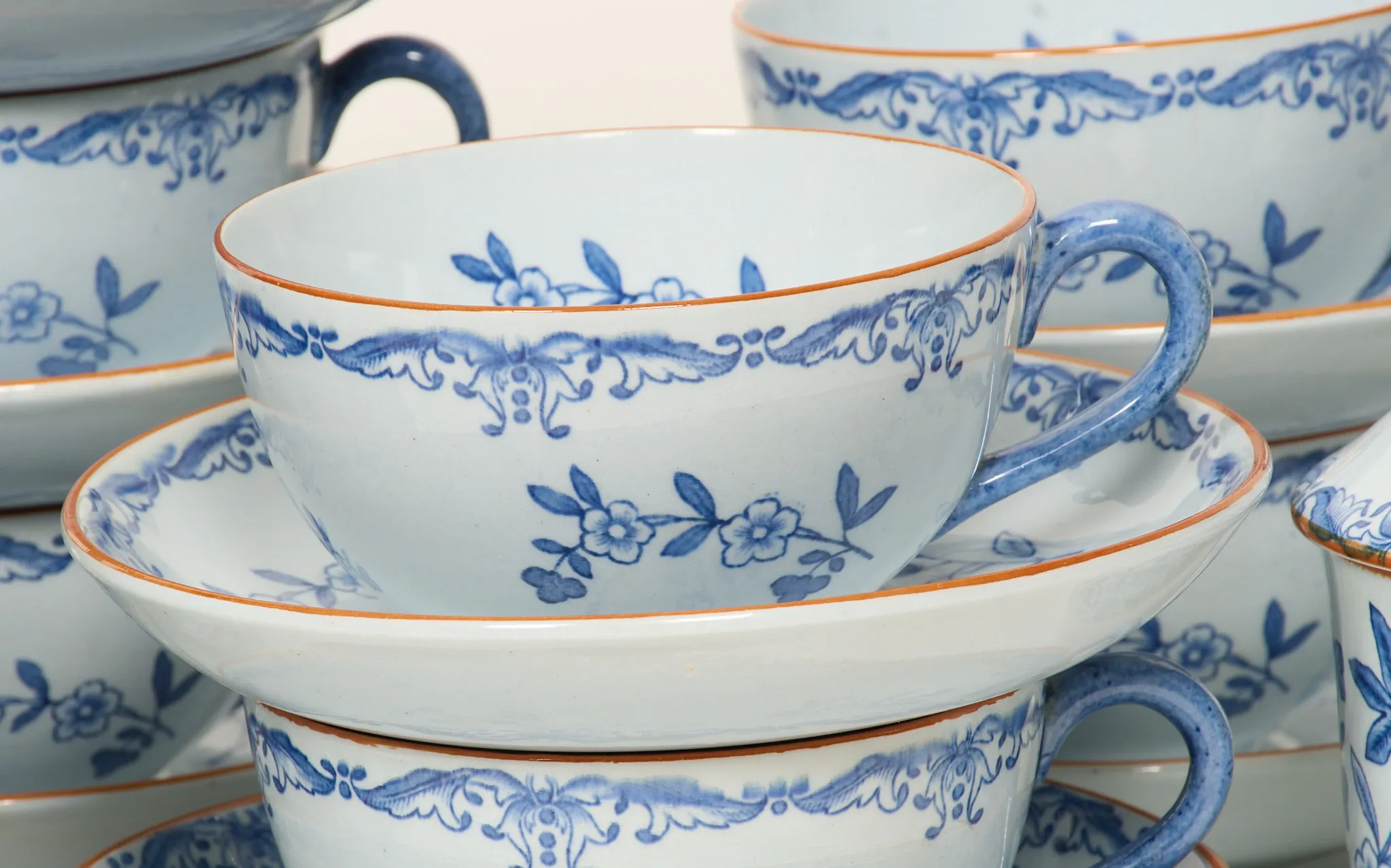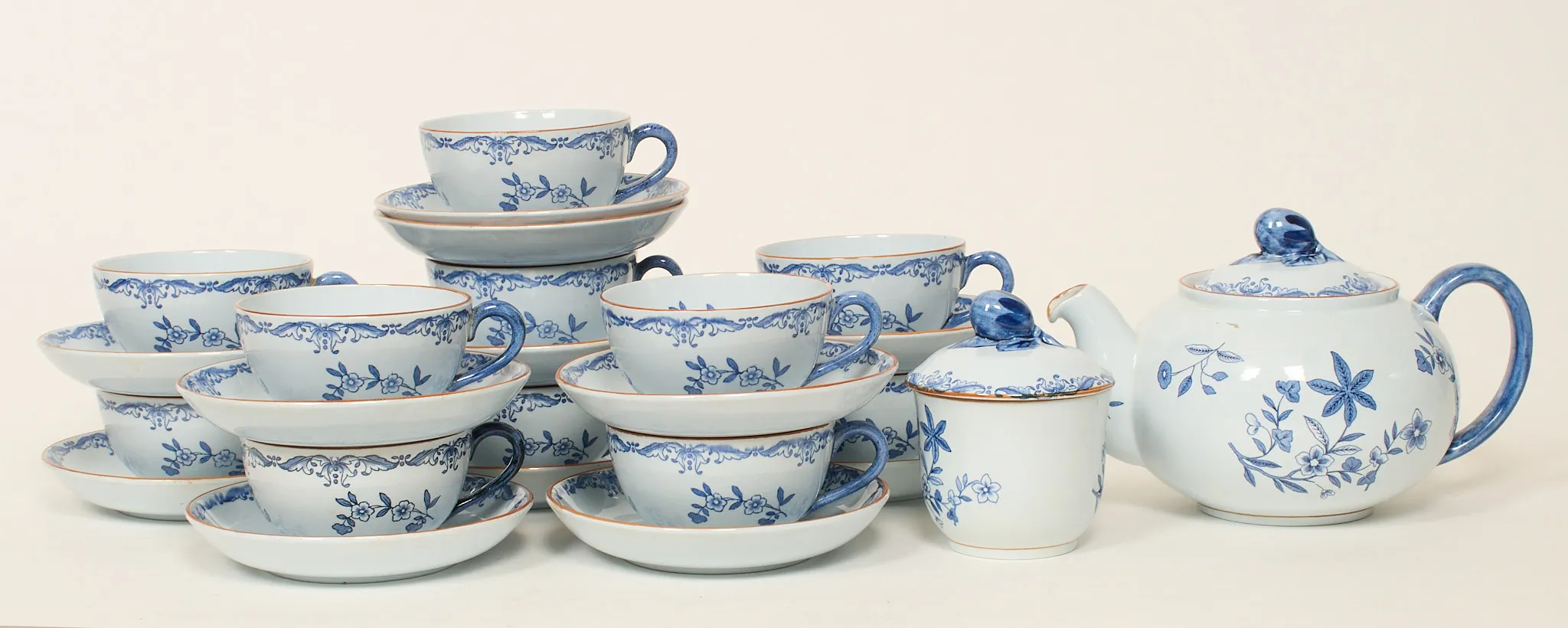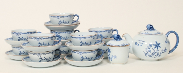 Äldre porslin, 11 koppar med fat, tekanna, samt sockerskål. Bruksslitage, glasyrkrackeleringar, enstaka del med missfärgning.