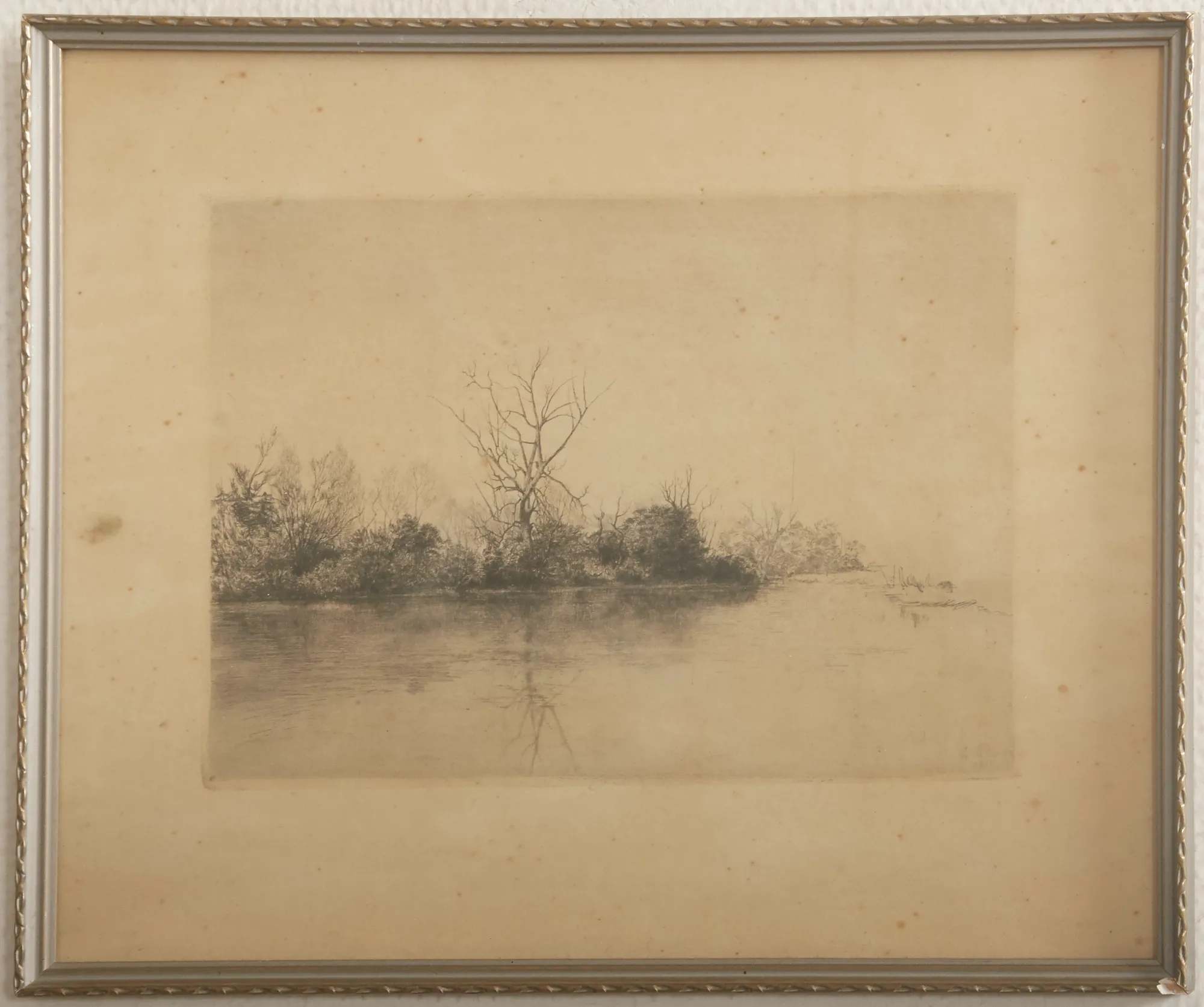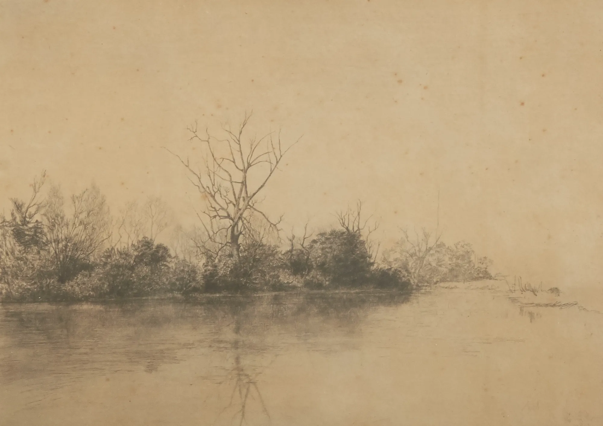 Vy över vatten, svag signatur, gulnat blad, bildmått 20 x 27 cm.