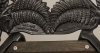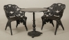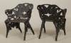 Ormbunksmodell, 2 stolar, samt bord, svartbemålat gjutjärn, samt ribbor i trä, senare renoverade, mått bord diam 74 cm, höjd 73 cm. Smärre bruksslitage, men stolar vickar.