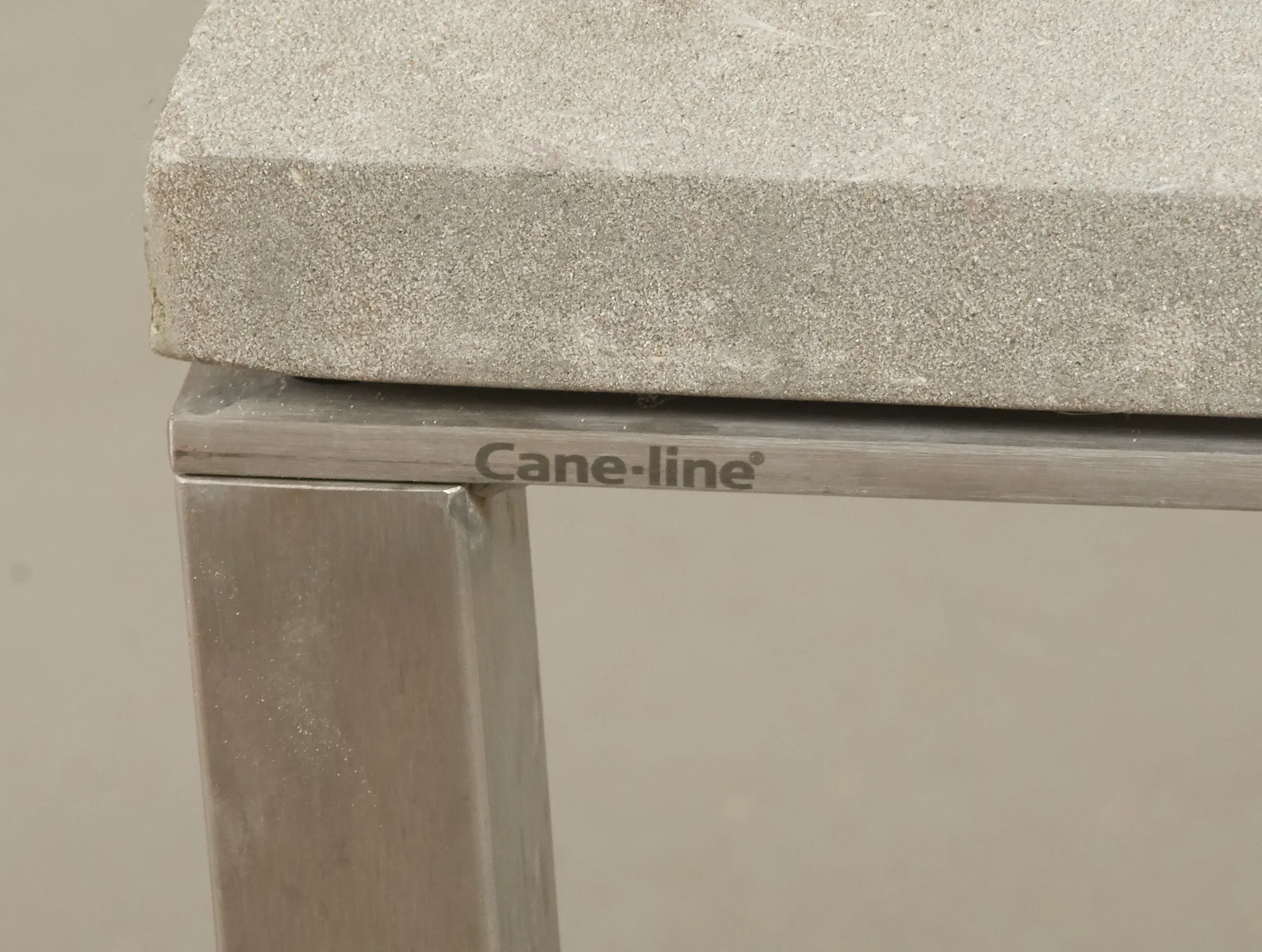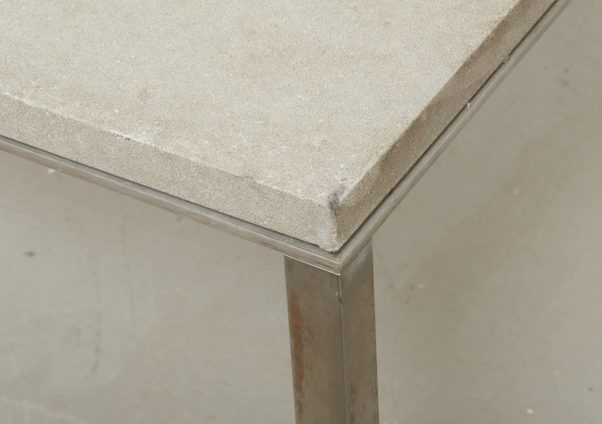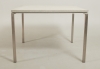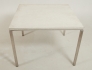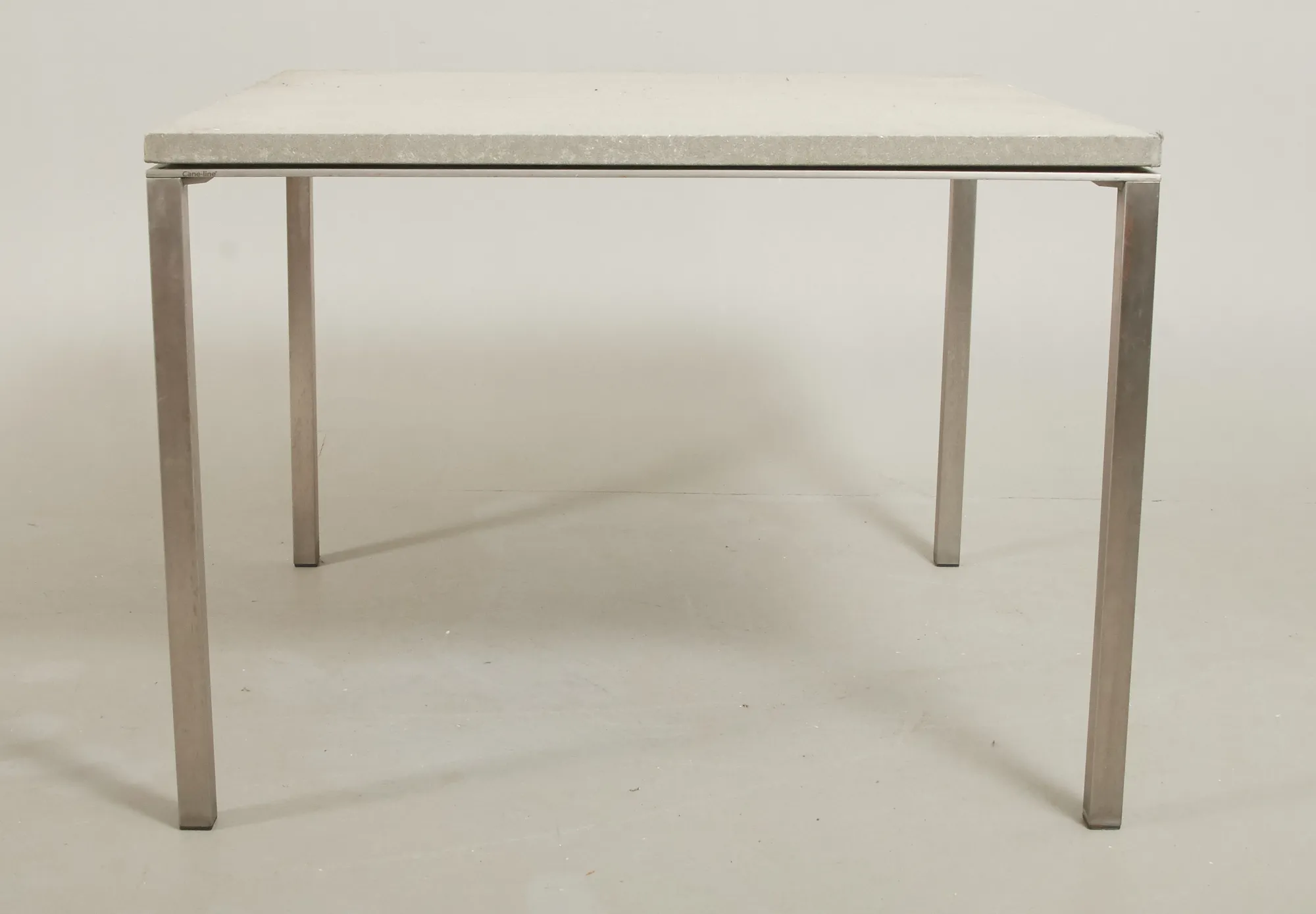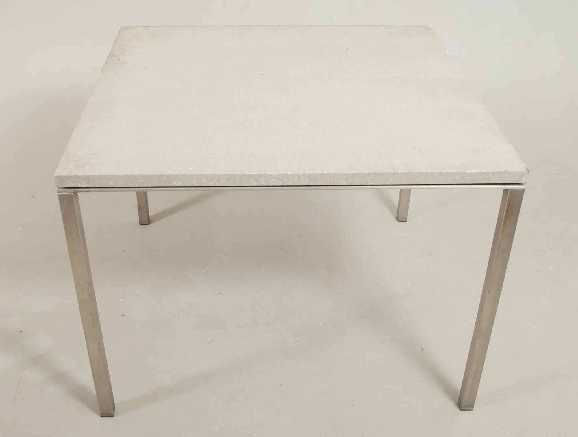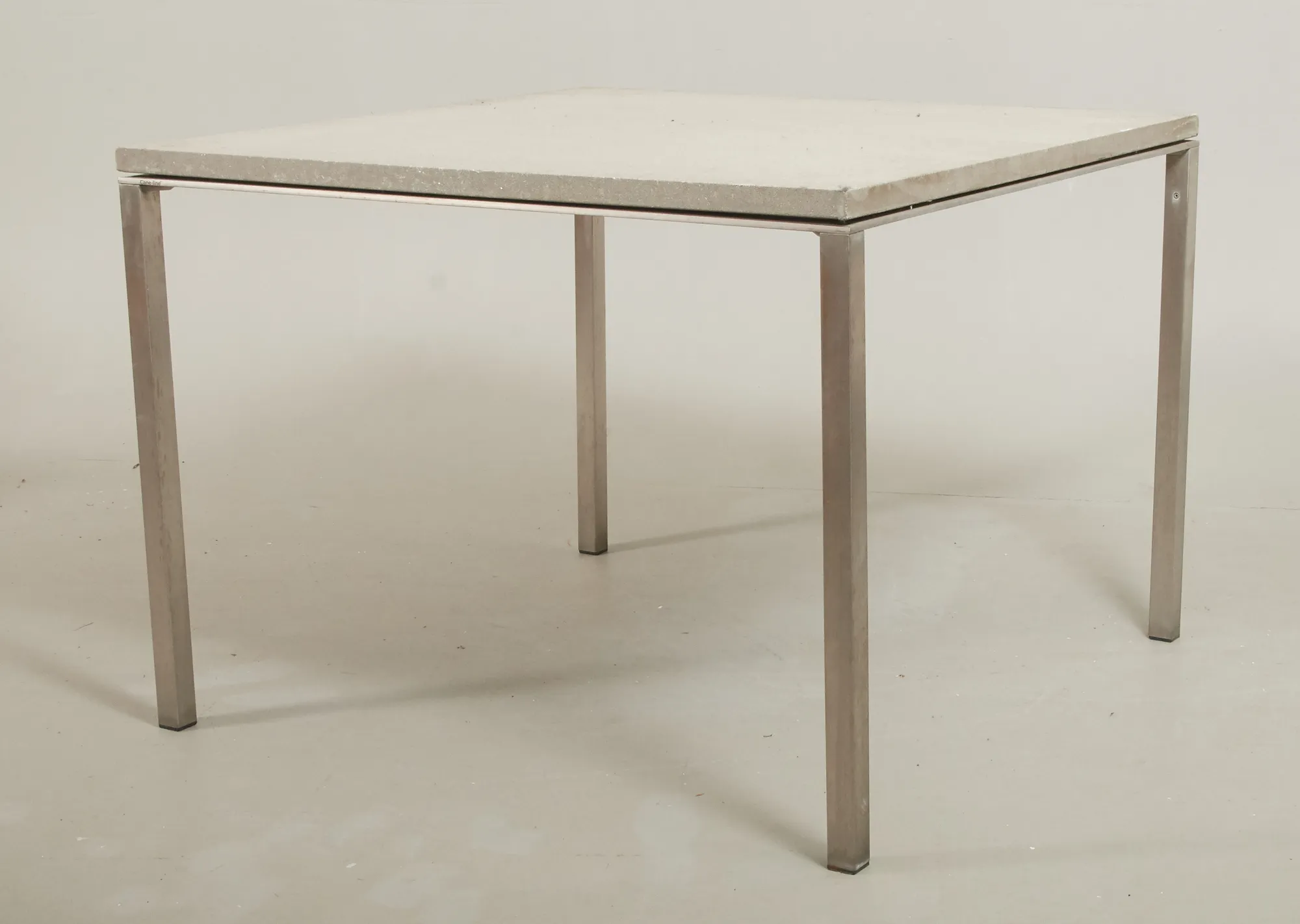 Nyare tillverkning, stomme i aluminium, skiva i keramik/betong, 100 x 100 cm, höjd 74 cm, smärre bruksslitage.