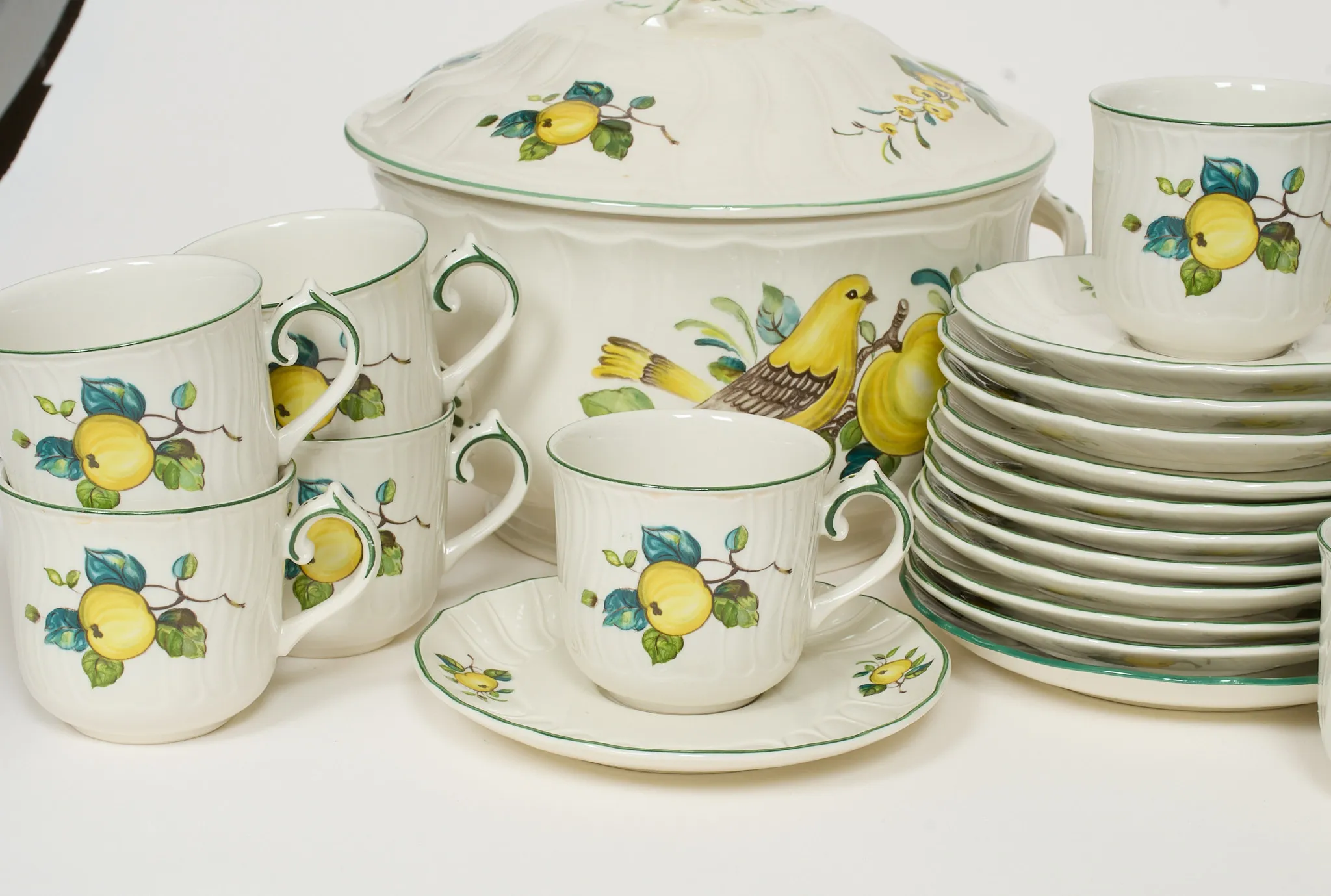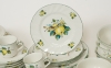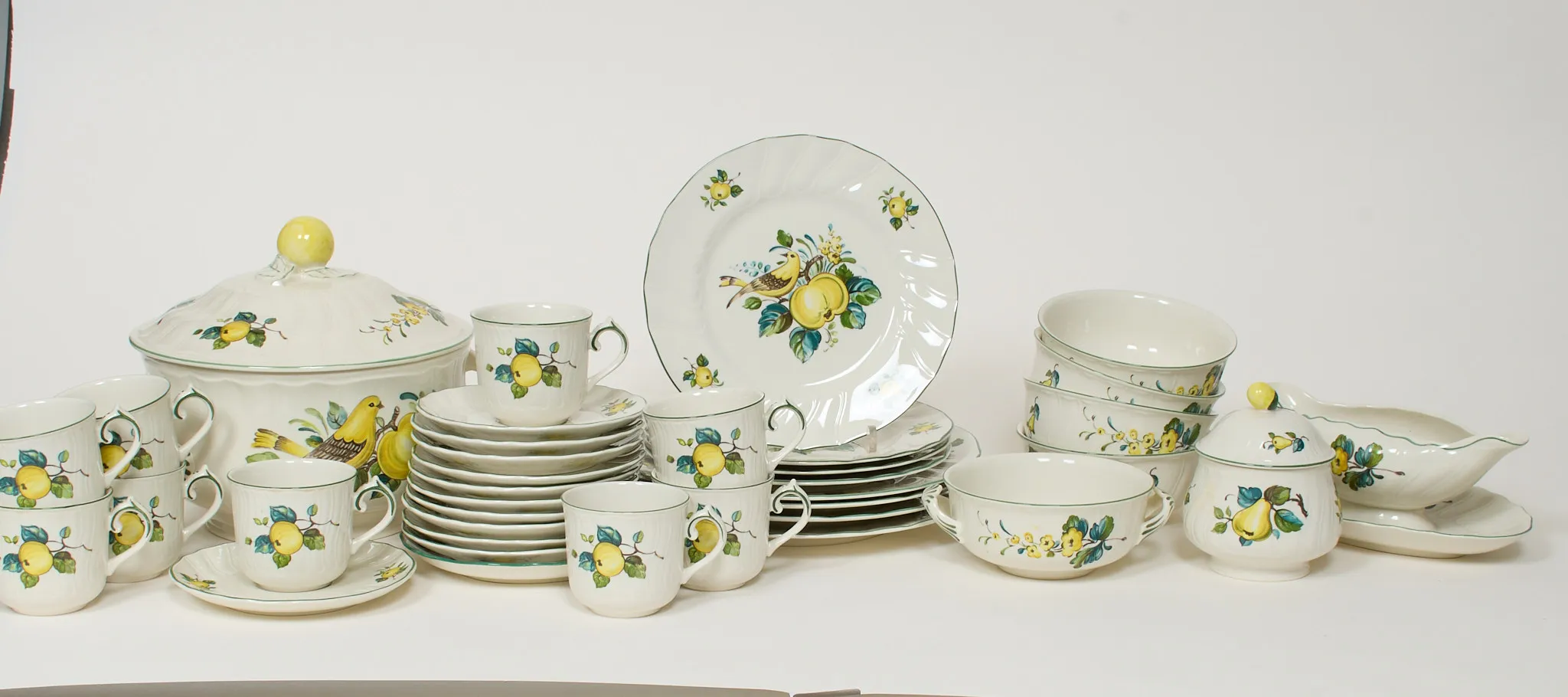 37 delar. 9 koppar + 11 fat, 4 mattallrikar, 4 assietter, 4 djupa skålar, soppterin, såssnipa, skål med hänklar, sockerskål, udda fat. Ytsmuts, smärre bruksslitage.
