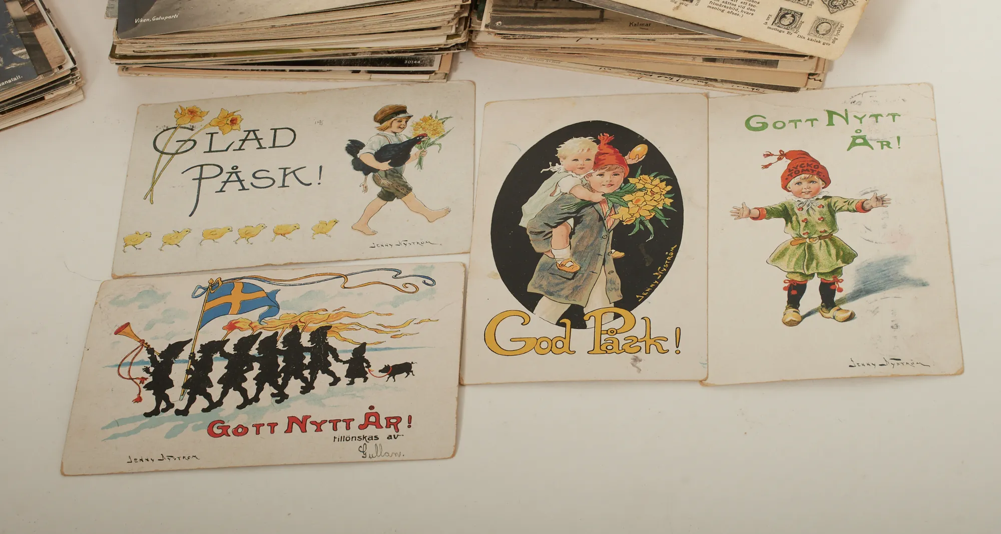 Ca: 800 vykort, många äldre från Sverige även Europa. Folder Bondetåget1914, 130 äldre idolbilder bl.a. Greta Garbo m.m. 72 Idrottsbilder (Eucalyptus), 76 bilder (Forsbergs) Fotbollslag: IFK, ÖIS, Gais, HIF, AIK, Elfsborg samt Malmö IFK.