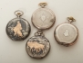 En Invar, fungerar, bakboett, jaktmotiv, diam 50 mm. En Billodes, fungerar, diam 50 mm, en Leijona, fungerar, diam 50 mm, samt ett fickur,bakboett lantbruksur, fungerar, diam 50 mm, skadad urtavla.