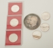 Medalj Norge 92,5% silverhalt totalvikt 139 gram, Mynt Norge 3 st 200 kronor 1980 62,5% silverhalt totalvikt 81 gram, Mynt Sverige 3 st 50 kronor 1975 92,5% silverhalt totalvikt 81 gram.