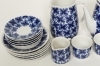 4 koppar med fat, samt assiett, gräddkanna, sockerskål, tillbringare, kaffekanna, samt ett extra fat och 2 assietter. Smärre bruksslitage.
