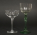 10 st champagnekupor, pantograferad dekor, höjd 14 cm, samt 9 st vittvinsglas med grön fot, höjd 19 cm, gott skick
