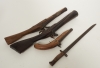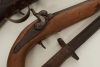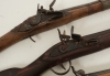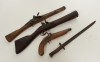 2 st Muskedunder flintlås, skador, reparationer. 1 st slaglåspistol med skador, samt 1 st bajonett med slitage.