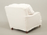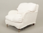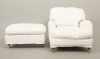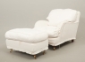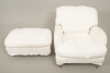 Fåtölj, samt fotpall, Med lösa dunplymåer, smärre bruksslitage, men något fläckig klädsel.