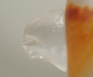 Stor vas, brun/gultonat, samt klarglas, hänklar i form av ansikte. Höjd 49 cm, tillverkningsdefekt.