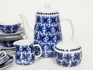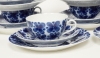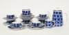 7 koppar, med fat, samt assiett, kaffekanna, gräddkanna, samt sockerskål, extra fat samt assietter medföljer. Smärre bruksslitage.