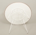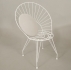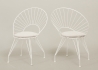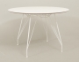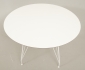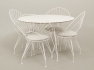 Vitlackerad metall, rostskyddsbehandlat, bordsskiva i laminat. Diam 110 cm, höjd 73 cm. Smärre bruksslitage, enstaka mindre repor på skiva. Dynor medföljer.