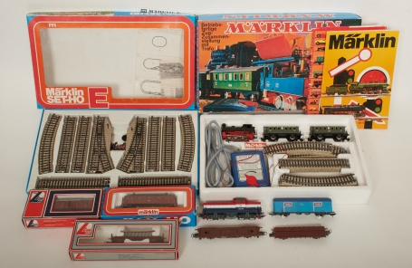 Märklin låda 2915, 5190. Märklin lok 884. Lima lok T 43220. Lima 5 vagnar, flera i orginalkartonger. Ej funktionstestat.